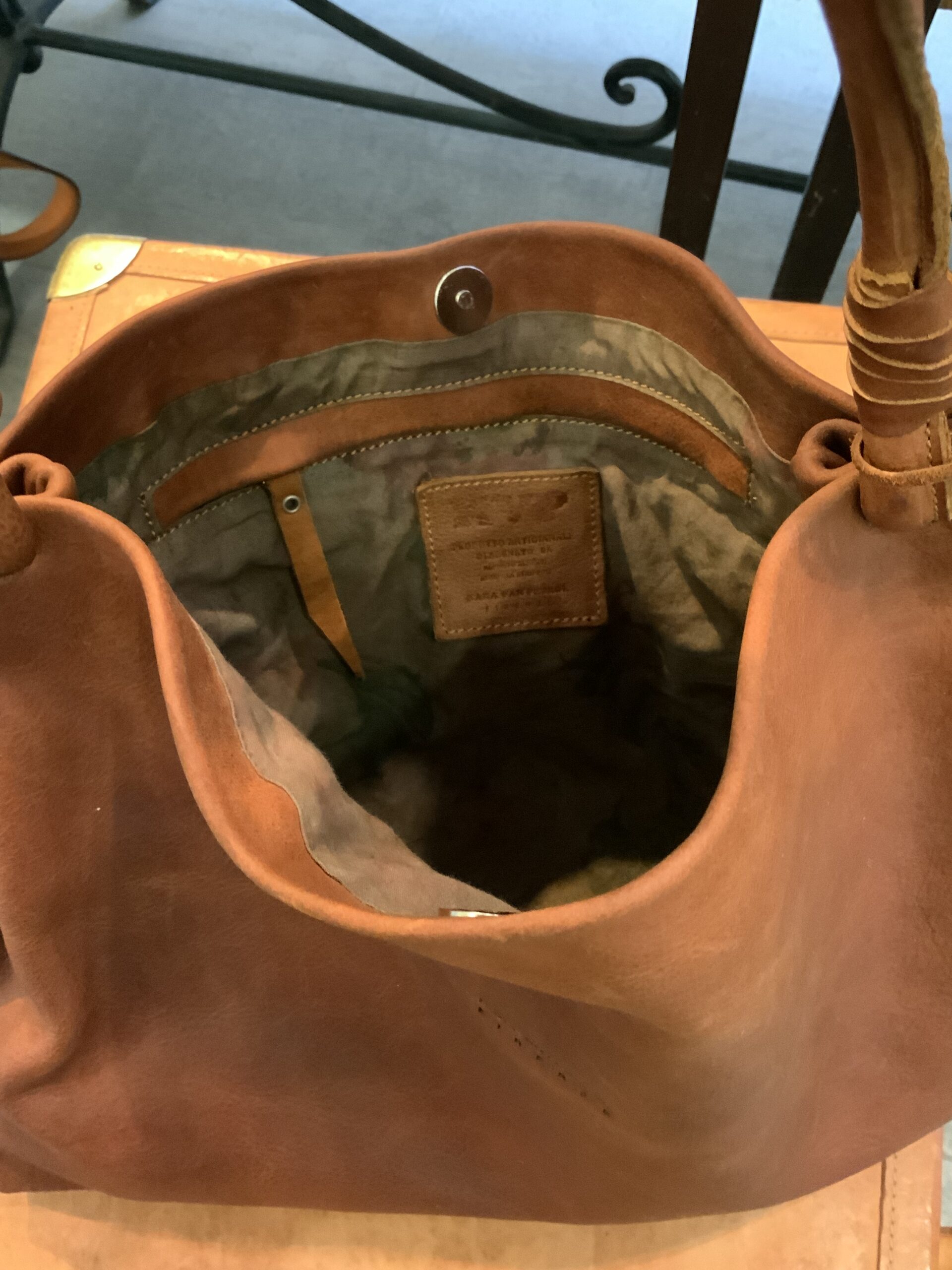 bag made of Kara Van Petrol vegetable-tanned leather. It is a very practice bag. It has a short shoulder strap. It si a bag to’ carry under the arm and has a small magnet that guarantees its closure. Inside it has a zip pocket.