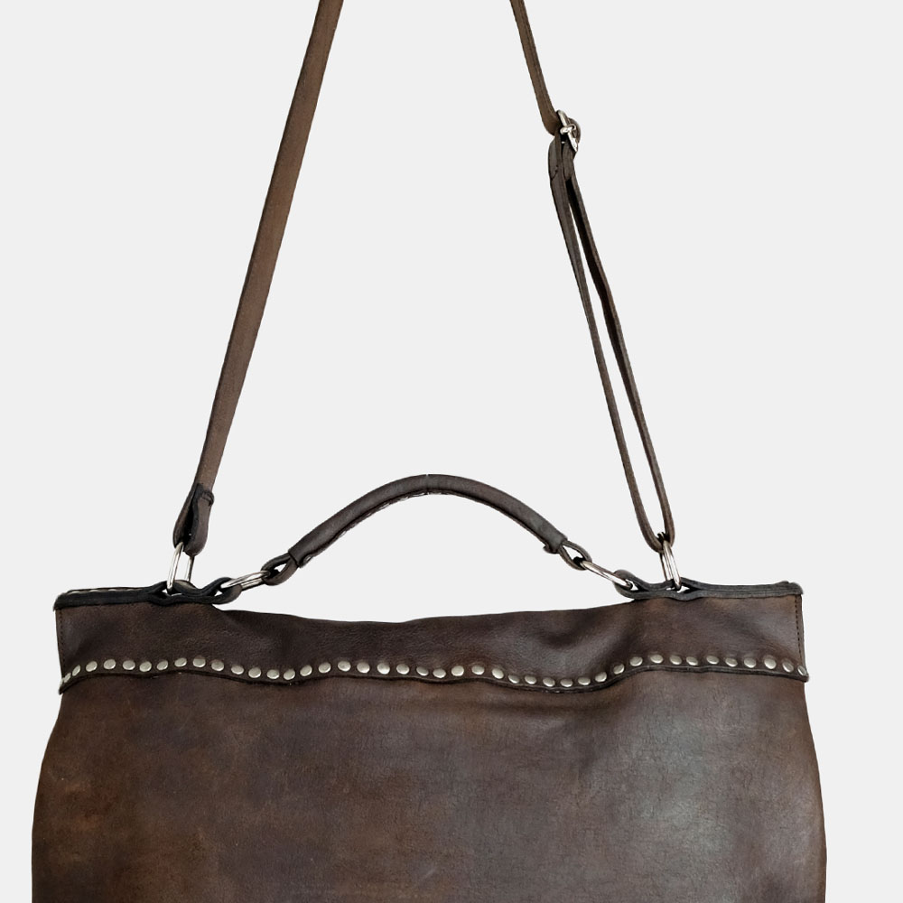 Unique in style and size, this iconic briefcase is crafted with the finest vegetable-tanned cowhide leather. The briefcase features 1 large inner compartment with a zip pocket place on the side and a “hidden” zip pocket placed beneath the flap. Externally the briefcase features a band of studs positioned on the top and back of the bag which accentuates its vintage style.