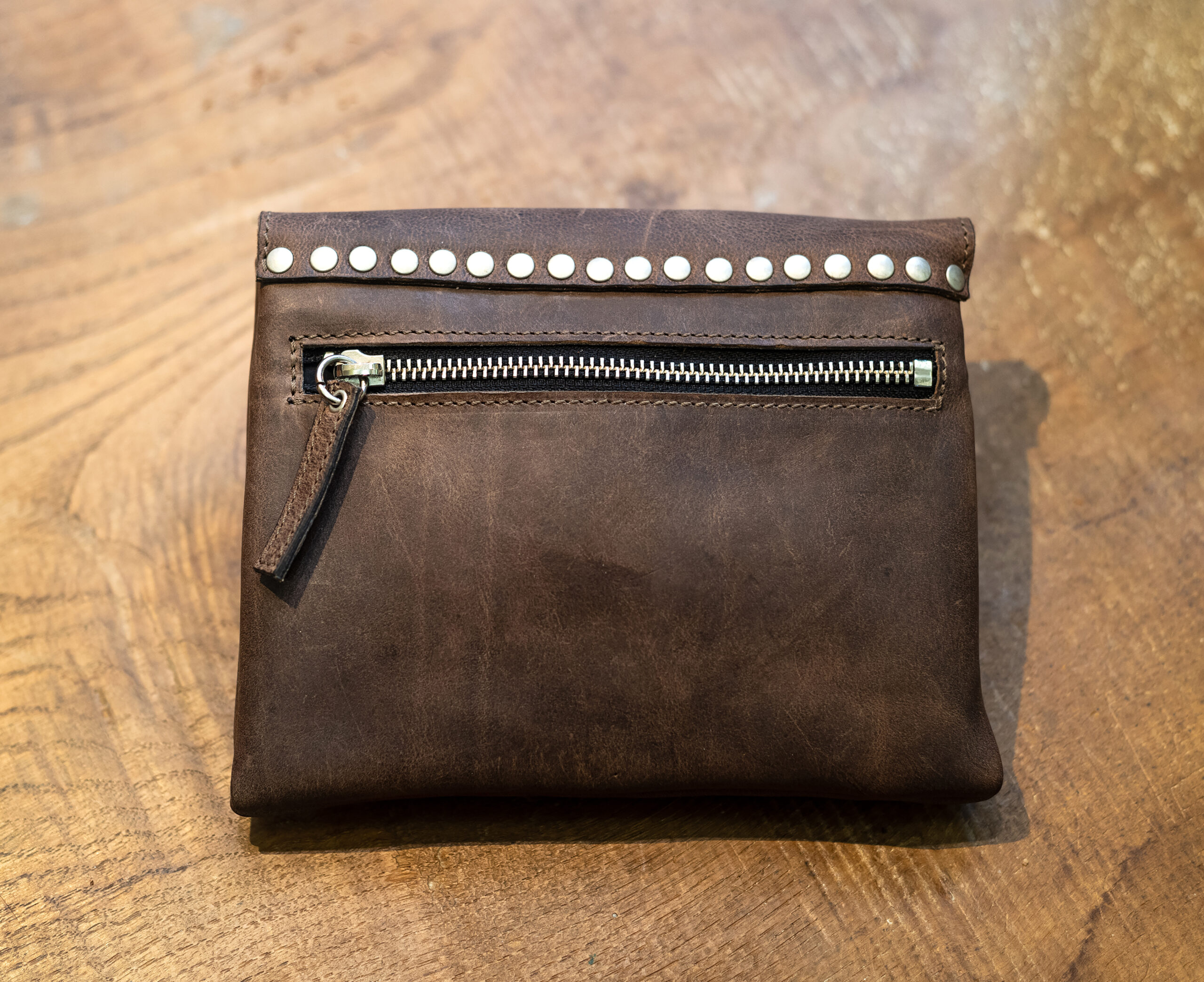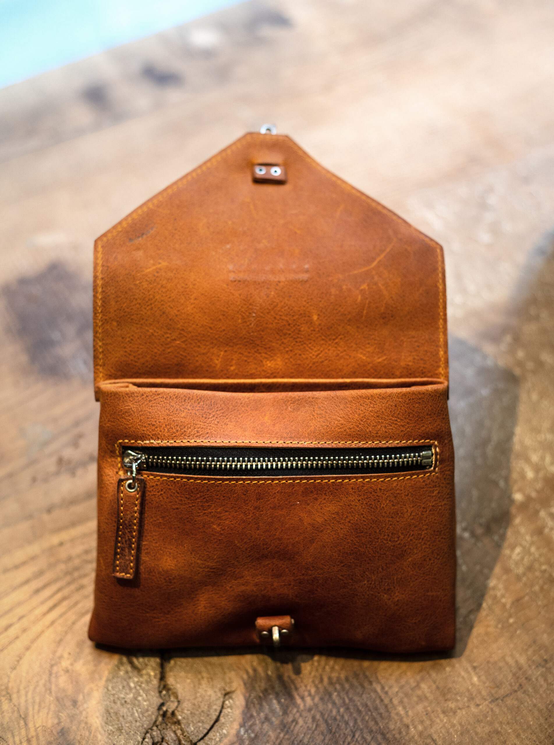 Wallet made of Kara Van Petrol vegetable-tanned leather. It has a zip pocket inside, and a zip pocket outside.